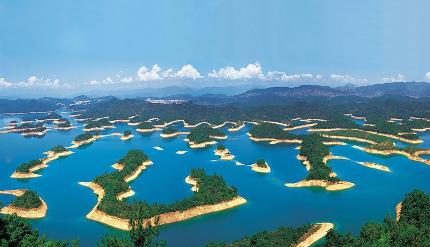 3.Hồ Vạn Đảo, Chiết Giang: Rộng khoảng 150 km2, đây là hồ nước nhân tạo với 1.078 hòn đảo lớn nhỏ được hình thành sau khi hoàn thành nhà máy thủy điện trên sông Xin'an.